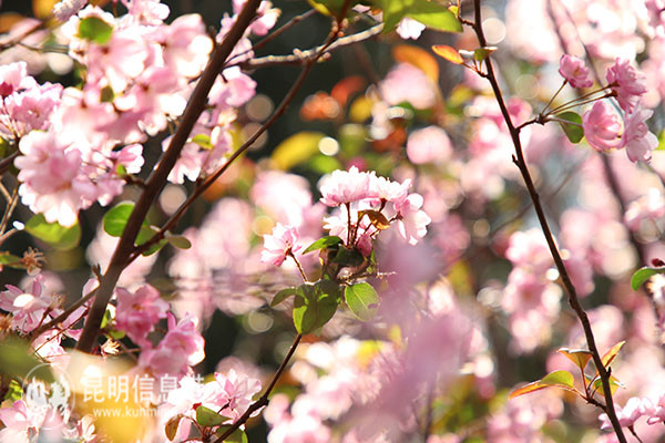 [InKunming--Kunming] Visitors admire hall crabapple in Kunming Yuantongshan Zoo on March 10, 2019. Every spring, blooming cherry blossom and hall crabapple flourish in light wind, making Kunming colorful. [Photo by Su Wenqian/InKunming]