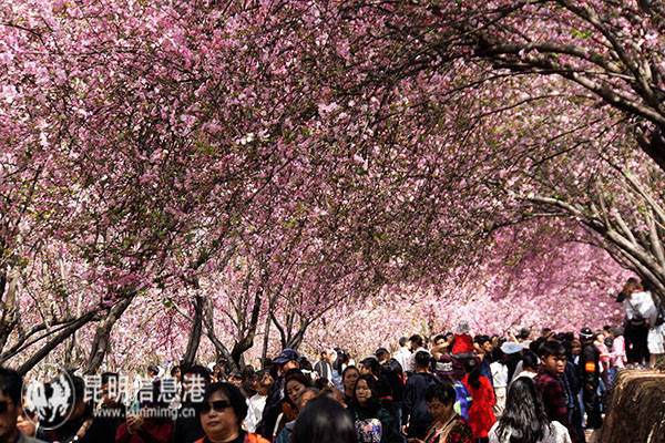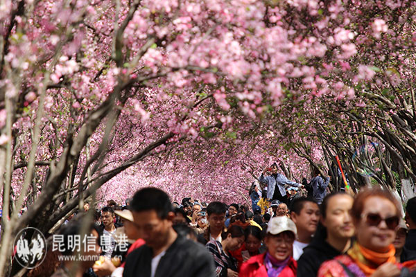 Visitors roam on the hall crabapple avenue. The 20th Kunming Cherry Blossom Festival kicked off at Kunming Yuantong Mountain Zoo on March 1st. [Photo by Su Wenqian/InKunming]