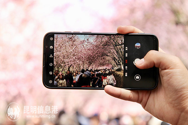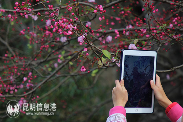 A visitor is using iPad to take photos of flowers. Cherry blossoms and hall crabapple have been planted at Yuantongshan Zoo since the 1920s. There are already 18,000 square meter of flowers. [Photo by Su Wenqian/InKunming]