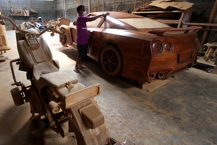 A worker makes a wooden craft motorbike at Tetap Jaya Art wooden workshop in Boyolali, Central Java, Indonesia. Oct. 11, 2022. (Photo by Bram Selo/Xinhua)