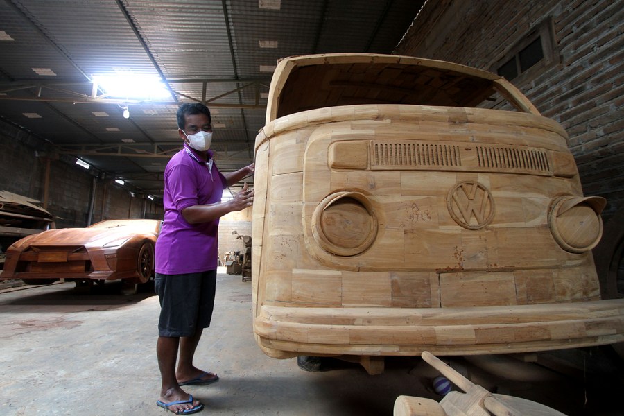 A worker makes a wooden craft vehicle at Tetap Jaya Art wooden workshop in Boyolali, Central Java, Indonesia, Oct. 11, 2022. (Photo by Bram Selo/Xinhua)