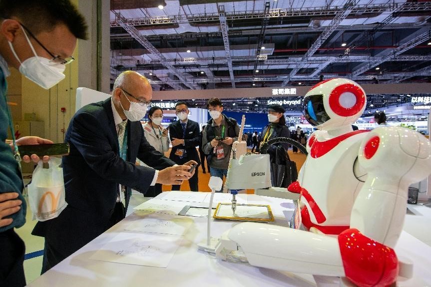 A robot developed by Japanese electronics maker Seiko Epson draws a portrait of a visitor at the fifth China International Import Expo, Nov. 5, 2022. (People's Daily Online/Weng Qiyu)