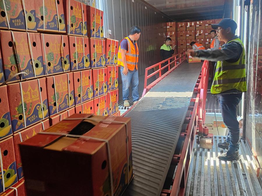 On Sunday, durian imports from Thailand were shipped into China via the Lancang-Mekong Express service of the China-Laos Railway. Compared with the same period last year, durian imports via the China-Laos railway so far this year surged by more than 7 times.