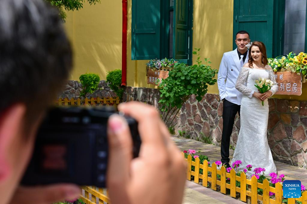 Tourists pose for photos on the Liuxing Street in Yining City, Ili Kazak Autonomous Prefecture, northwest China's Xinjiang Uygur Autonomous Region, May 10, 2024. (Xinhua/Ding Lei)