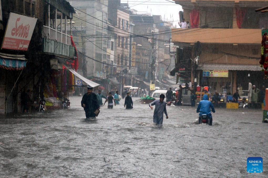 Commuters are seen on a flooded road during heavy monsoon rain in Rawalpindi, Pakistan, on July 29, 2024. (Str/Xinhua)
