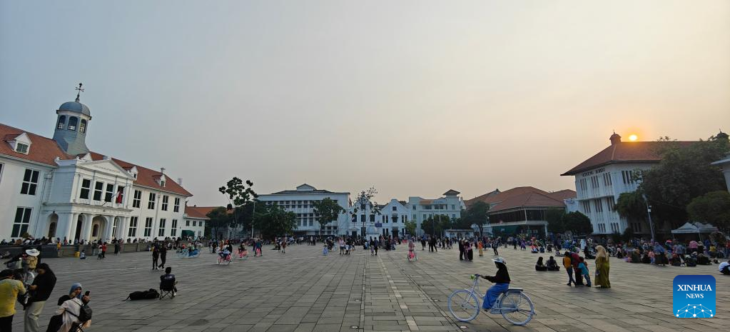 This photo taken with a mobile phone shows people visiting Taman Fatahillah in Jakarta, Indonesia, July 11, 2024. Located on the northwest coast of Java Island, Jakarta is the largest city in Indonesia and is currently the political, economic and cultural center of the country. (Xinhua/Xu Qin)