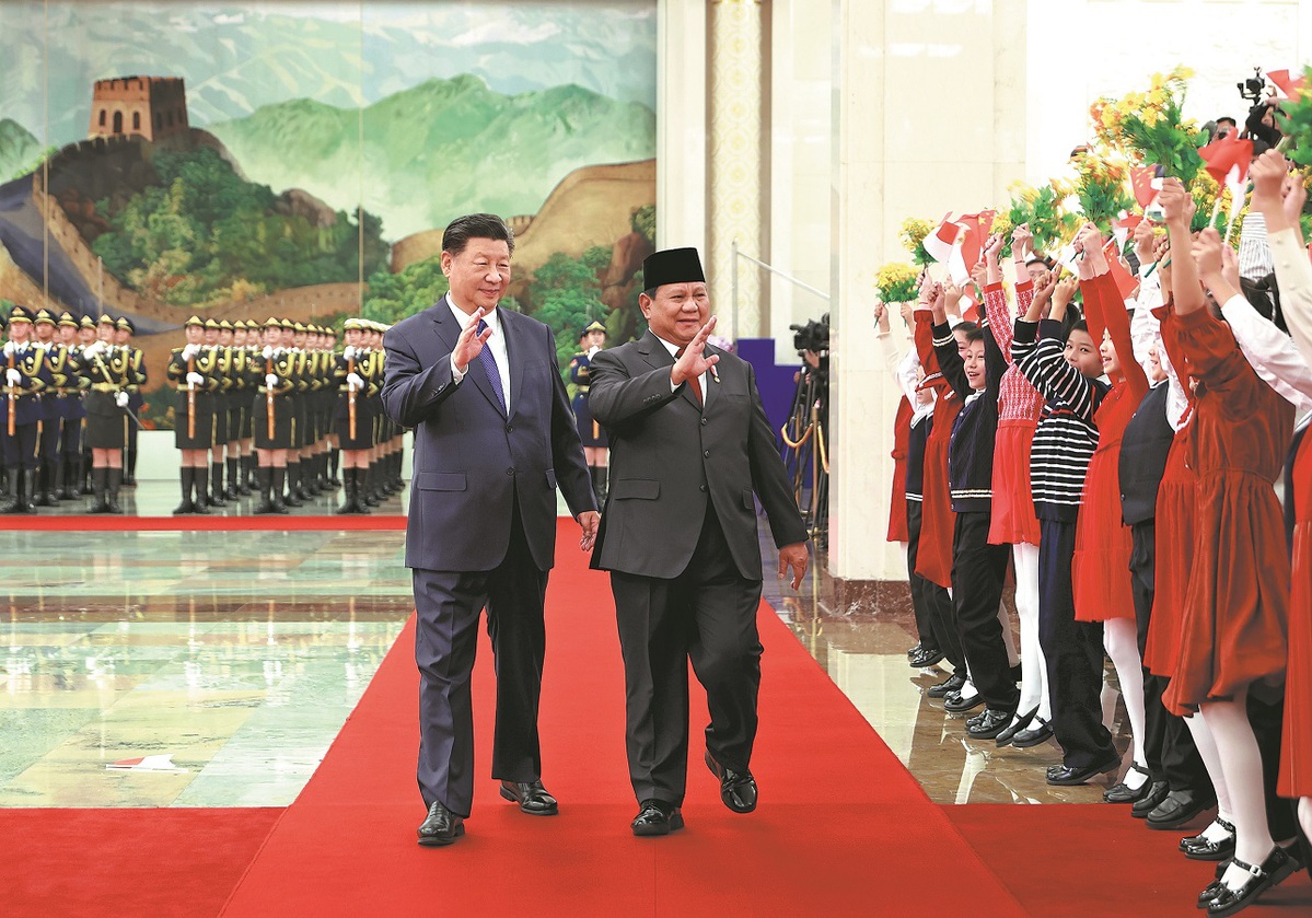 President Xi Jinping and visiting Indonesian President Prabowo Subianto attend a welcoming ceremony before holding talks at the Great Hall of the People in Beijing on Saturday. FENG YONGBIN/CHINA DAILY