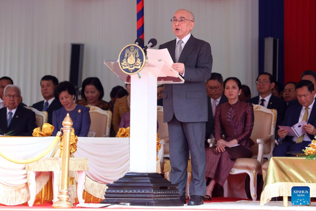 Cambodian King Norodom Sihamoni delivers a speech during the inauguration of the residence of the Great Supreme Patriarch Chuon Nath at Unnalom Pagoda in Phnom Penh, Cambodia on Feb. 17, 2025. (Photo by Sovannara/Xinhua)