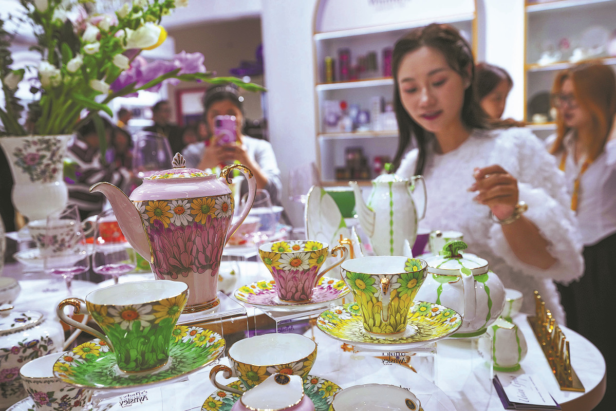 A visitor looks at porcelain products on display at the UK booth during the ongoing fifth China International Consumer Products Expo in Haikou, Hainan province. WANG CHENGLONG/FOR CHINA DAILY