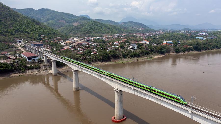 A passenger train runs on a bridge of the China-Laos Railway in Luang Prabang, Laos, May 28, 2023. (Photo by Chen Chang/Xinhua)