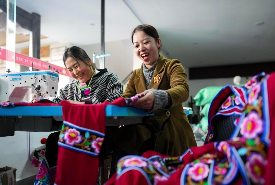 Jin Ruirui (R) talks with an embroiderer at her studio in Mouding County, southwest China's Yunnan Province, Feb. 9, 2026. (Xinhua/Chen Xinbo)