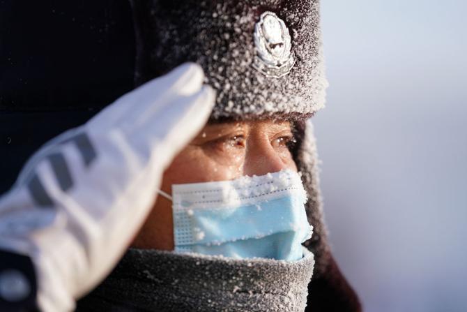 ↑黑龍江省大興安嶺地區(qū)呼中區(qū)公安局交警孫臣的眼睫毛和帽子都上了霜(2021年1月8日攝)。