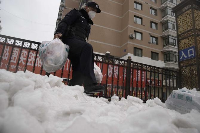 ↑在黑龍江省哈爾濱市平房區(qū)一處小區(qū),卡點執(zhí)勤民警幫助運送生活物資(2021年11月8日攝)。