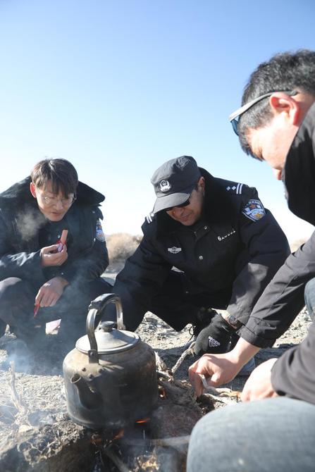 ↑甘肅省公安廳森林公安局安南壩分局民警在甘肅安南壩野駱駝國家級自然保護(hù)區(qū)巡邏途中燒水(2021年1月8日攝)。