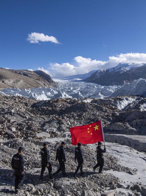 ↑西藏山南市浪卡子縣普瑪江塘邊境派出所的移民管理警察在巡邏途中(2021年11月20日攝)。