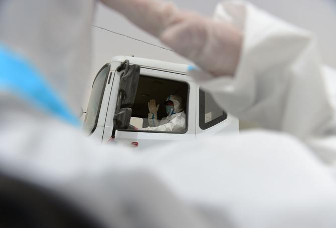 ↑在新疆喀什地區(qū)塔什庫爾干塔吉克自治縣的卡拉蘇出入境邊防檢查站,貨車司機向執(zhí)勤一隊女民警孫雪揮手致意(2021年5月5日攝)。