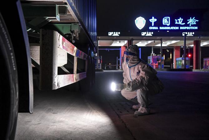 ↑廣西東興出入境邊防檢查站民警在檢查停在東興口岸限定區(qū)域內(nèi)的貨車(2021年12月30日攝)。