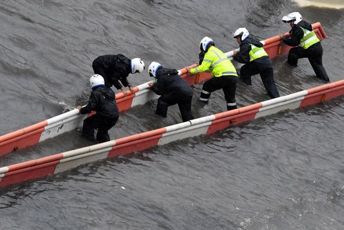 ↑ 交通警察在河南省鄭州市花園路冒雨修復(fù)交通設(shè)施。(2021年7月20日攝)。