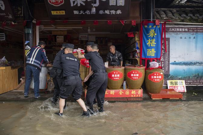 ↑ 在四川省閬中市,嘉陵江水漫進(jìn)閬中古城內(nèi)多條街道,公安民警幫助商戶轉(zhuǎn)運物資(2021年10月5日)。