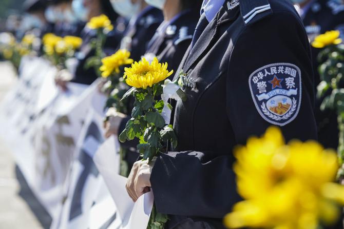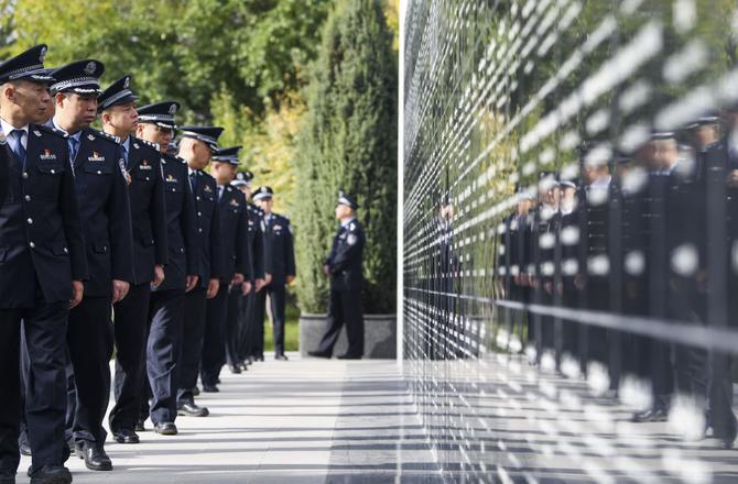 ↑ 在新疆公安英烈紀(jì)念園,新疆維吾爾自治區(qū)公安廳民警代表在祭奠英烈(2021年9月30日攝)。