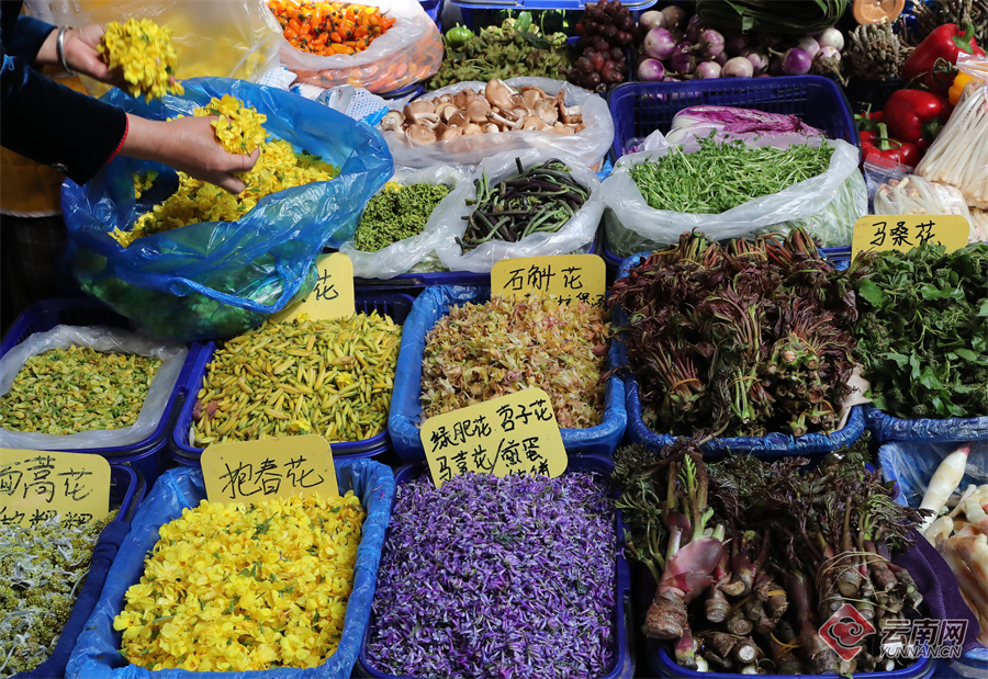 昆明大觀篆新農(nóng)貿(mào)市場(chǎng)銷售山花野菜的攤位前市民游客絡(luò)繹不絕。