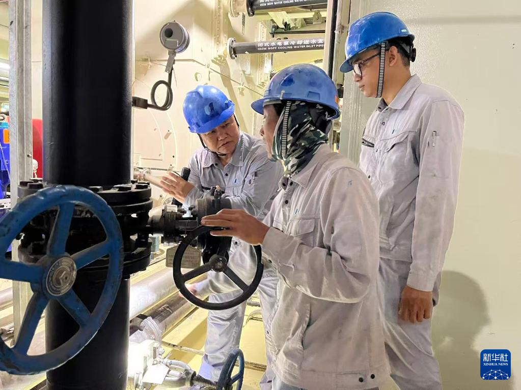 2025年7月2日,在印度尼西亞南蘇門答臘省麻拉埃寧縣,華電(印尼)玻雅發(fā)電公司設(shè)備維護(hù)部機(jī)務(wù)一班師傅談志東(左一)現(xiàn)場指導(dǎo)印尼徒弟度一(左二)和法赫里檢查電泵冷油器系統(tǒng)。新華社發(fā)(羅江華攝)