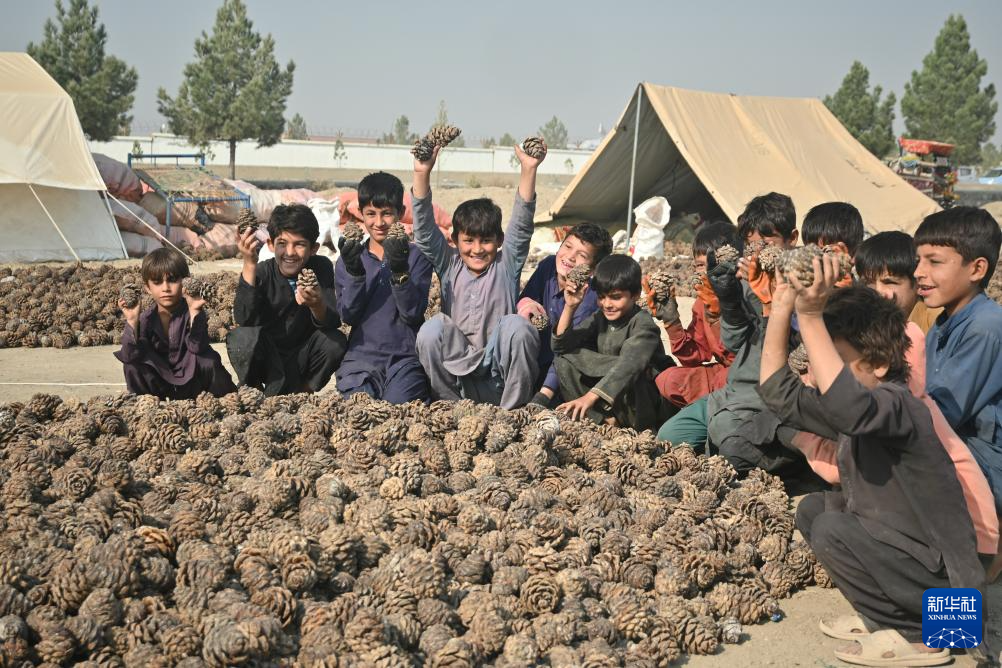 10月28日,在阿富汗霍斯特省的松子加工交易市場,當地兒童幫忙采集松子。新華社記者張藝繽攝