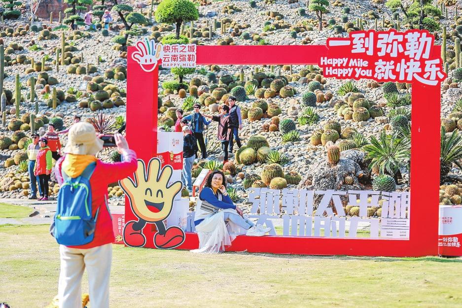游客在彌勒太平湖山地石漠化公園打卡拍照。本報記者 高吳雙 黃興能 攝