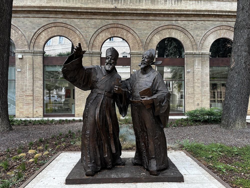 在意大利小城馬切拉塔拍攝的以利瑪竇與中國(guó)明代科學(xué)家徐光啟為原型的雕塑《利徐談道》。