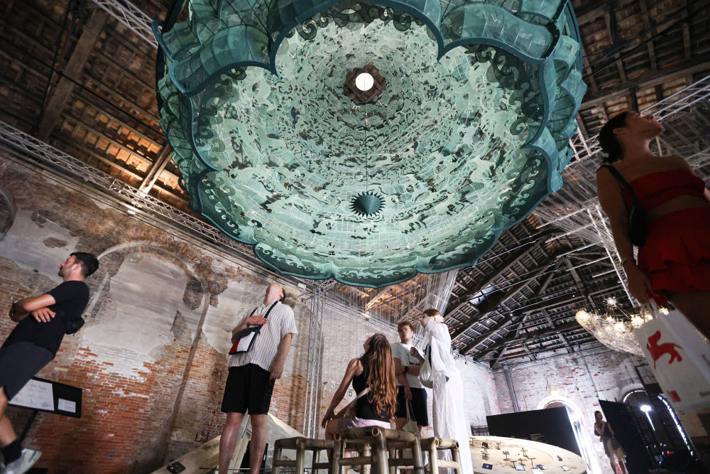 2025年7月16日,在意大利威尼斯,參觀者在第19屆威尼斯國(guó)際建筑雙年展中國(guó)館觀看展品《蒼穹》。本屆中國(guó)館展覽以良渚文明、敦煌石窟、北京中軸線、城市交通與未來(lái)城市為主題,展現(xiàn)中國(guó)建筑在傳統(tǒng)與未來(lái)之間的對(duì)話與思考。