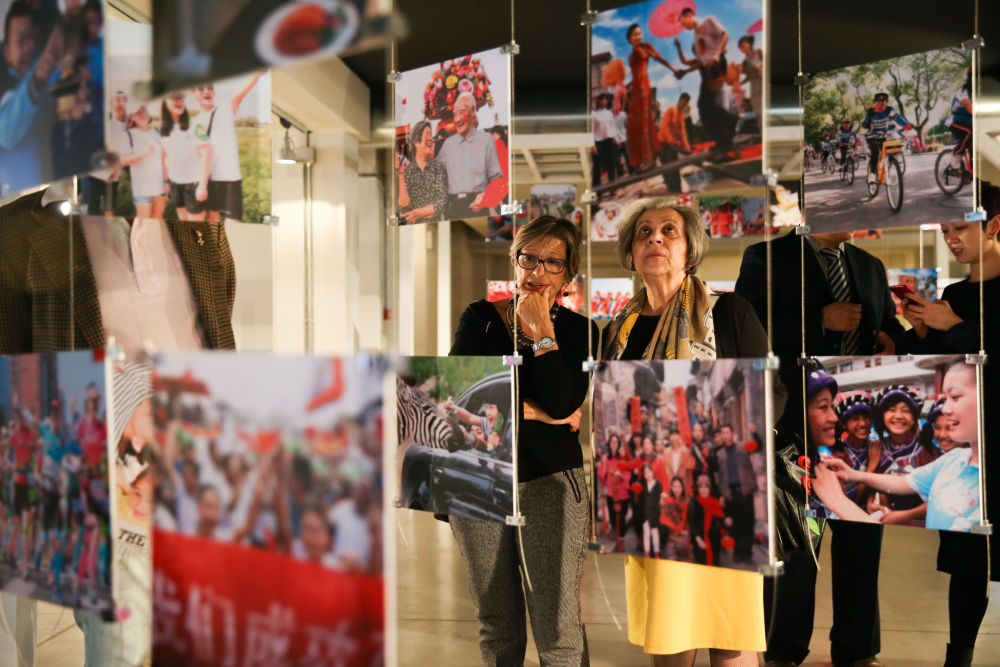 2019年3月22日,參觀者在意大利羅馬舉行的“千億像素看中國(guó)——城市與人”互動(dòng)主題展上觀看中國(guó)人生活面貌的照片。展覽不僅展示了中國(guó)大城市的發(fā)展變遷、普通人的生活場(chǎng)景等,還聚焦中國(guó)和意大利經(jīng)貿(mào)人文交往,講述中意兩國(guó)的友好故事。