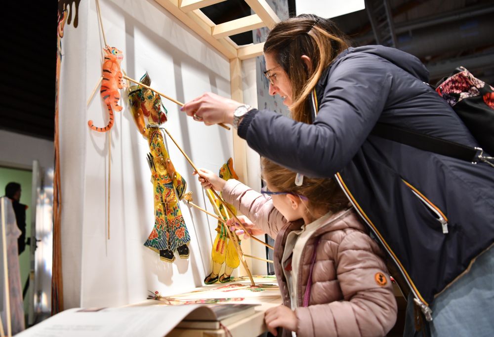 2023年4月25日,在意大利佛羅倫薩舉辦的國(guó)際手工藝展覽會(huì)上,參觀者體驗(yàn)中國(guó)皮影文化。