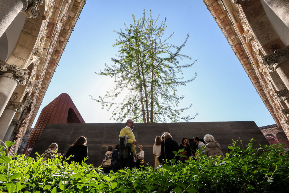 2025年4月11日,在意大利米蘭國(guó)立大學(xué),人們參觀中國(guó)設(shè)計(jì)師吳濱的設(shè)計(jì)作品《杳然庭》。