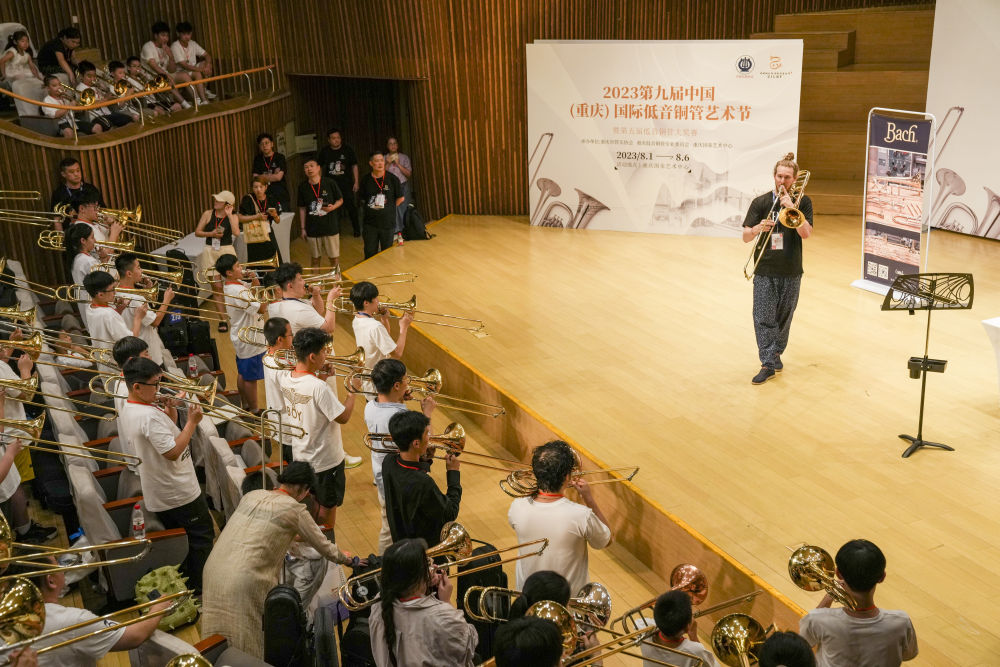 2023年8月1日,在重慶舉辦的第九屆中國(guó)國(guó)際低音銅管藝術(shù)節(jié)的一場(chǎng)公益大師課上,來(lái)自意大利的長(zhǎng)號(hào)藝術(shù)家彼得·斯坦納在指導(dǎo)愛(ài)好者練習(xí)長(zhǎng)號(hào)。