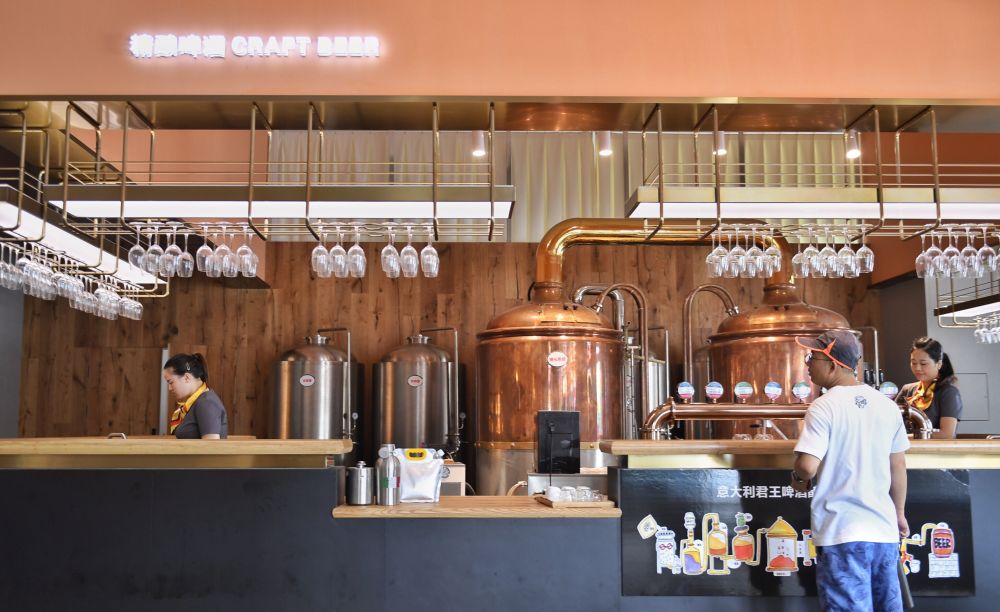 2020年7月17日,一位市民在成都國(guó)際鐵路港亞蓉歐國(guó)家(商品)館意大利館體驗(yàn)精釀啤酒。