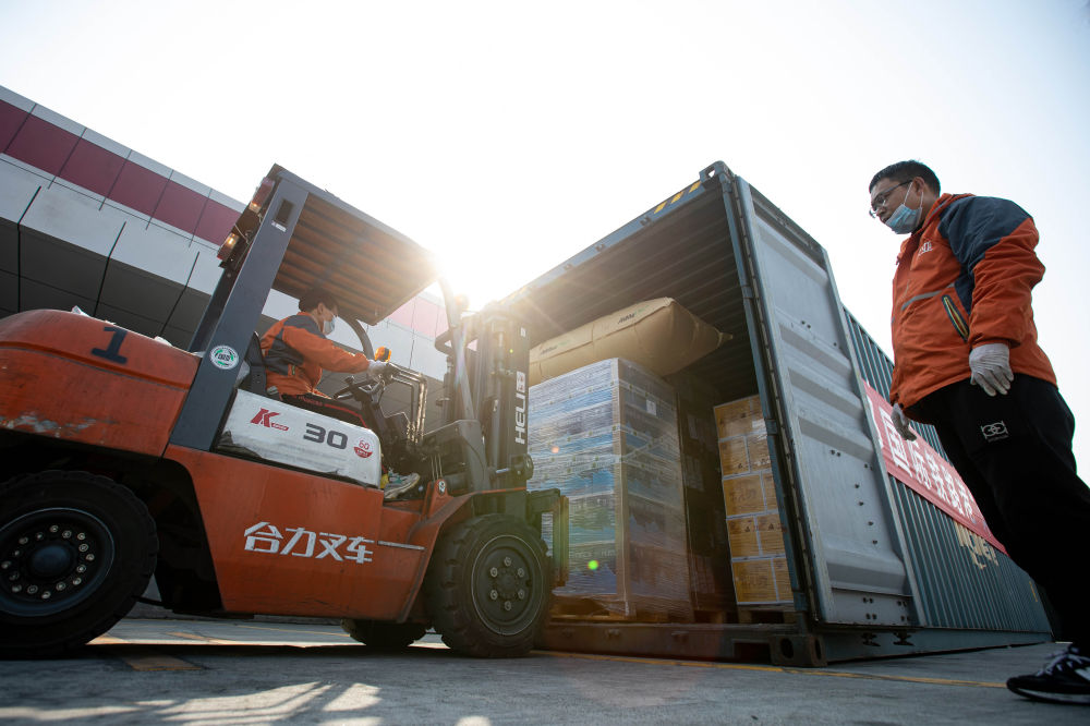 2021年2月1日,在成都國(guó)際鐵路港,工作人員在搬運(yùn)貨物。當(dāng)日,一列滿載意大利紅酒、餅干等食品的中歐班列抵達(dá)成都國(guó)際鐵路港,為川渝兩地群眾帶來(lái)了豐富的“洋年貨”。