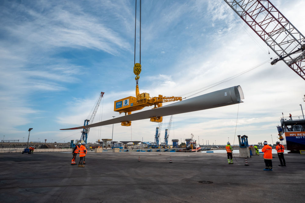 2022年1月27日,在意大利南部海港塔蘭托,中國(guó)和意大利施工人員吊裝風(fēng)電葉片。中國(guó)技術(shù)、國(guó)際合作讓意大利向著增加清潔能源、應(yīng)對(duì)氣候變化的目標(biāo)又邁進(jìn)了一步。