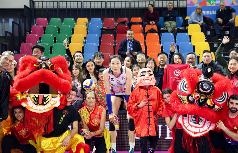 2024年2月4日,在意大利斯坎迪奇,斯坎迪奇隊(duì)球員朱婷與當(dāng)?shù)匚椠埼瑾{表演者和觀眾在賽后合影。該舞龍舞獅表演隊(duì)由意大利當(dāng)?shù)氐闹袊?guó)功夫愛(ài)好者組成。