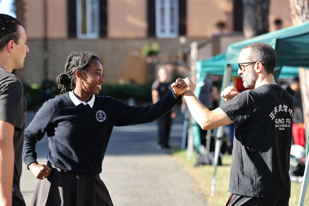 2025年10月10日,在意大利羅馬,學(xué)生在中秋主題游園會(huì)上體驗(yàn)中國(guó)功夫。武術(shù)、拓印、投壺、包餃子等多個(gè)游園項(xiàng)目吸引了眾多學(xué)生和家長(zhǎng)參與體驗(yàn)。