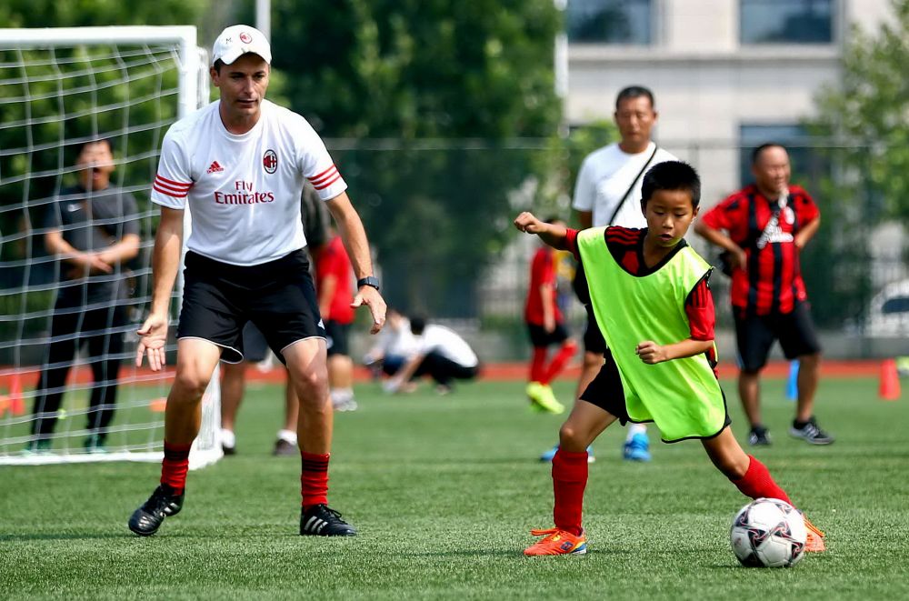 2016年7月28日,AC米蘭足球俱樂(lè)部專業(yè)足球教練托馬斯(左)在指導(dǎo)學(xué)生訓(xùn)練。當(dāng)日,北京市大興區(qū)魏善莊鎮(zhèn)教育委員會(huì)與意大利AC米蘭足球俱樂(lè)部中國(guó)青訓(xùn)營(yíng)合作開(kāi)展的校園足球培訓(xùn)項(xiàng)目在魏善莊中學(xué)開(kāi)營(yíng)。
