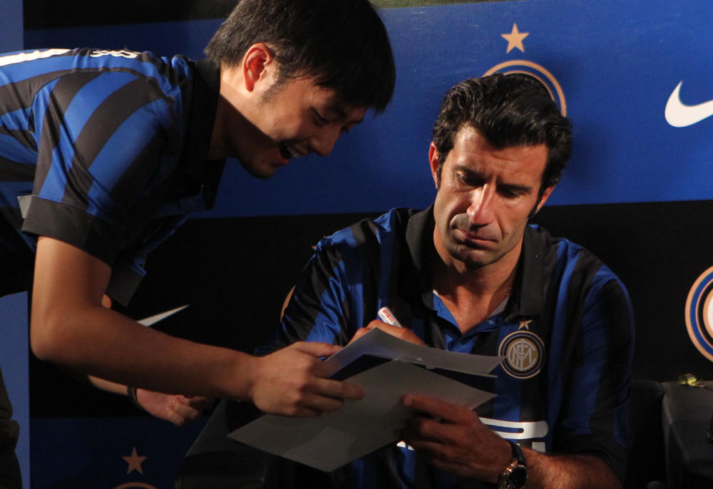 2011年8月4日,意大利國(guó)際米蘭足球俱樂(lè)部形象大使菲戈(右)在活動(dòng)現(xiàn)場(chǎng)為球迷簽名。當(dāng)日,意大利國(guó)際米蘭足球隊(duì)部分球員在北京東單體育場(chǎng)與中國(guó)球迷見(jiàn)面。